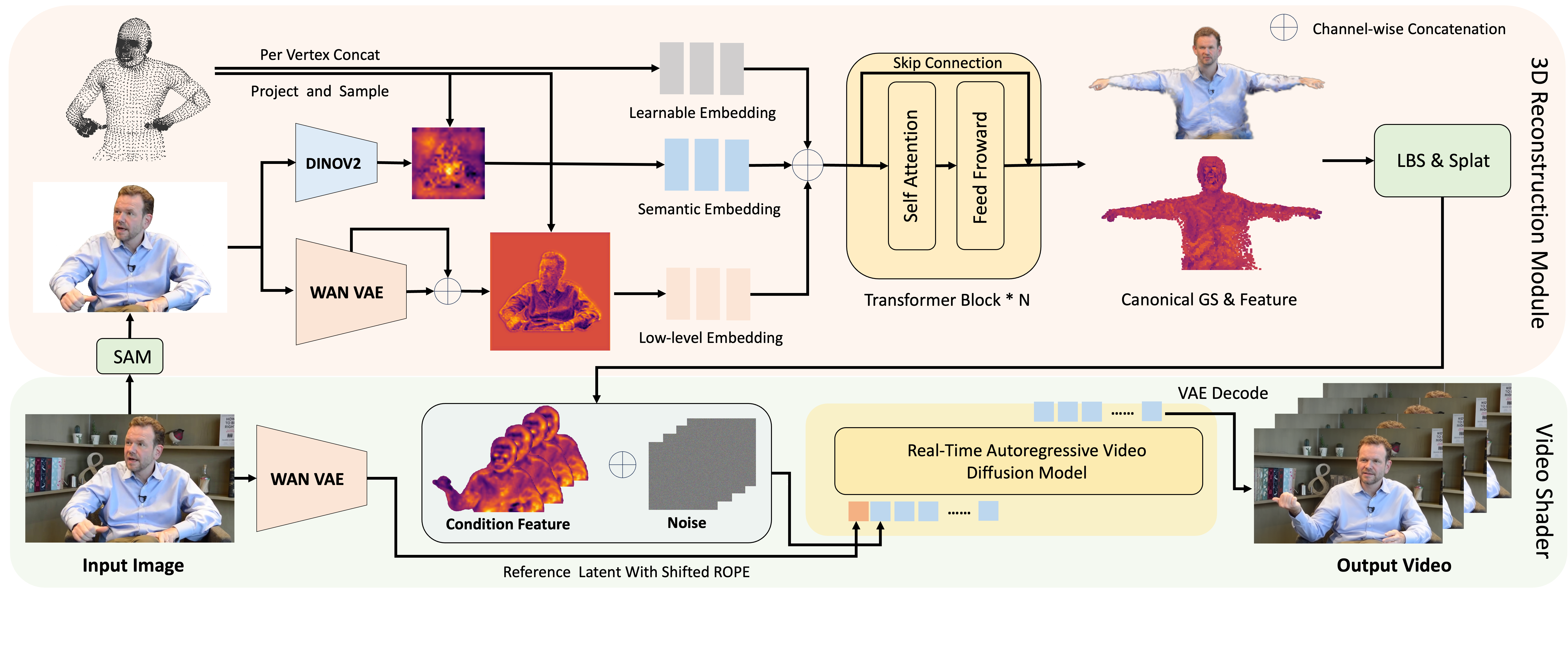 Overview of the proposed ViSA. In the first stage, we train a one-shot, feed-forward transformer to regress a 3D Gaussian avatar in a predefined canonical space, conditioned on geometric, semantic, and low-level embeddings. In the second stage, we employ an autoregressive video model as a video renderer, conditioned on the 3D-aware features from stage one, to generate photorealistic results in real time.